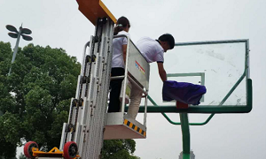 | 近期3V3籃球賽即將在奧體會展中心前面的廣場上舉行,甲方安排師傅們把籃球框安裝好后發(fā)現(xiàn)籃板上比較臟,需要清理干凈 |