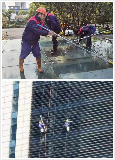水務(wù)大廈總高98米,用地面積14980平方米,主體為玻璃幕墻,年久未洗,玻璃污染嚴重,遠遠望去一層霧蒙蒙的,遠不如對面的常發(fā)大廈看上去閃閃發(fā)亮。于是高正集團物業(yè)項目部把這個情況向甲方匯報,甲方也非常同意這次大規(guī)模的外墻清洗,畢竟近十年沒洗了。于是物業(yè)開始著手聯(lián)系施工方出方案、出報價,再給甲方審核,一系列準備工作完成就開始動工了。