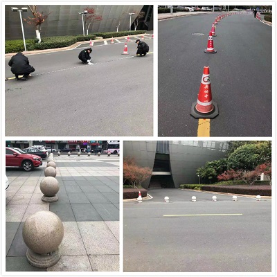每到中午時段,高正集團奧體中心物業管理部就會加派人手支援,經理、安保主管也會到現場指揮。項目部也多次與甲方溝通,討論現場管理方案。今早清晨,高峰段過后,物業管理部的保安就拿上油漆,給錐形筒定位劃線。大家拿皮尺蹲在地上一段一段量好距離,把幾十個定位點都畫好線,等油漆干后再把錐形筒擺放上去。別的地段項目管理部也按照甲方的要求,把石墩都放到位,由于石墩很重,幾個保安想妙招,拿小推車拖,最終大家齊心協力把工作完成了。