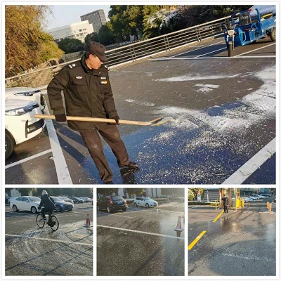 經過一夜的大雪,30號早晨現場緊急動員起來,管理員、秩序維護員、保潔員全部都投入到化冰化雪的工作中來,首先先環繞奧體中心全方位做了巡檢,從路面、崗亭到屋檐、樹木都做了詳細的摸排,排除一切安全隱患,對各結冰區域鋪撒鹽屑加快融化。崗亭由于大風雨雪天氣也跳電,現場秩序維護員及時報修送電,同時安排好現場車輛繞行。
