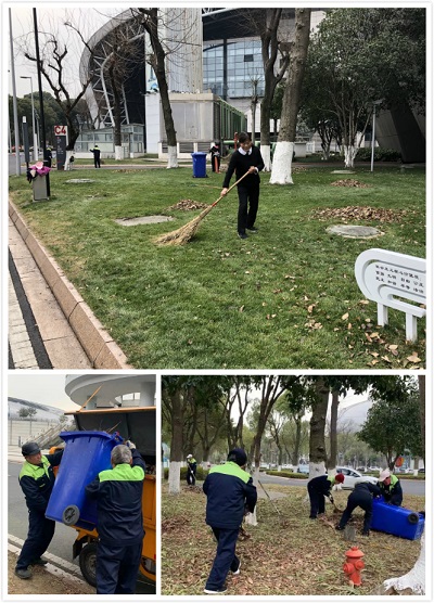 奧體中心面積大,樹木多,常常一夜過來落葉滿地,保潔員的工作量和清運垃圾的次數都增加了不少。那一把把笨拙的掃帚在他們手中仿佛充滿了魔力,把頑皮的樹葉理得服服帖帖,聚成一堆,再倒進垃圾桶。保潔主管郁志賢總是和大家一起工作,有的區域落葉特別多,大家做完各自區域的活就集中起來一起清掃,掃的掃、搬的搬,抬的抬。面對著惡劣的天氣和掃不完的落葉,我們不斷提高作業效果,加強巡檢督查,盡力維護奧體的干凈整潔。