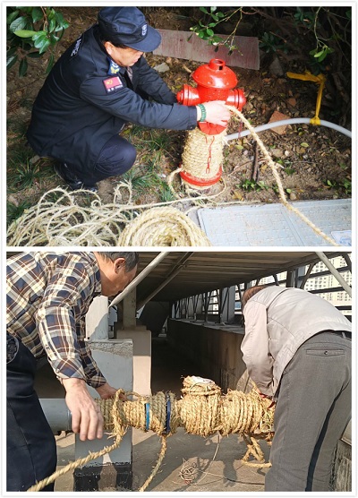 物業(yè)先買(mǎi)來(lái)保溫用的材料,保溫布以及麻繩,員工們進(jìn)行分工,有的去外圍包水表、有的去頂樓包管道、有的去包消防栓,大家忙的不亦樂(lè)乎,不一會(huì)所有用水設(shè)施都包裹的嚴(yán)嚴(yán)實(shí)實(shí),可以抵抗這次的寒潮。雖然我們做好了防護(hù)措施但也不是百分百安全,以后還要不斷地加強(qiáng)巡邏,一旦發(fā)現(xiàn)異常情況立即上報(bào)處理。
