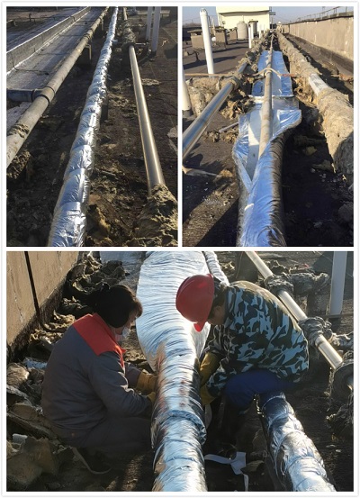 水管上有之前的包的隔熱棉,都已老化的,先要用棍子將舊的隔熱棉處理掉,才能包上新的隔熱棉。在處理舊的隔熱棉時,一定要站在上風口,老化的隔熱棉在撥動的時候里面的玻璃纖維材質會散落,如果站在下風口就會飛到臉上,引起過敏。將原隔熱棉處理干凈后就可以包新的隔熱棉了,新的隔熱棉在買來的時候就是分段好的,不需要剪裁,5米一卷,包起來也方便。兩名維保工先合力將隔熱棉塞進管子下方,然后一個人將隔熱棉兩邊拉緊裹住水管,另一個人用隔熱膠帶粘住接縫的地方,然后拉緊,防止松動,一個人裹水管,一個人粘膠帶,分工合作。此項工作花了兩天的時間將其完成,更換后即使碰上氣溫驟降也不怕水管會的凍住了,而且此類的隔熱棉使用時間也較長,可以幾年不用再進行更換。