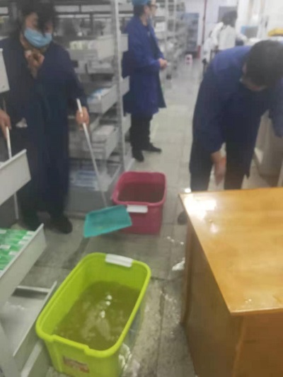 就在1月16日下午,物業項目內科主管剛剛上班,住院部藥房的人員就打來電話,反映藥房里的空調管爆裂了,現在是屋里仿佛下著大雨,地面上全是水,都已經溢到外面的大廳里面了。接到電話后,內科主管馬上聯系了保潔王師傅,讓他來拿吸水機先去吸水,同時通知內科外科的洗地師傅一起幫忙吸水。藥房的保潔員也一起幫忙,掃水的掃水、倒水的倒水,還要把休息室的東西全部搬出來,洗地的師傅才能進去吸水,其他藥庫的師傅見了都過來幫忙。