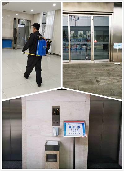根據甲方要求,大門口首先要做好外來人員登記,要求出示健康碼并且提示戴好口罩測體溫方能進入園區。項目主管從倉庫里拿來了隔離帶和指示牌,對進出主大樓人員進行管控。大廳門口及電梯處放了提示戴口罩的牌子,電梯里面張貼已消毒和戴口罩的提示牌子,減少進出人員的焦慮感。保安隊長每天背上噴壓式的消毒桶,一天三次對各大樓層公共區域、電梯進行消毒。保潔也對負責區域定時消毒,減少病毒傳播。