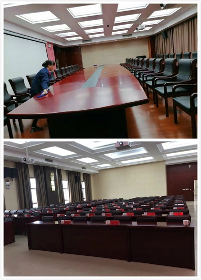 一大早,大家就開始分工行動,保潔打掃各個會議室,保安師傅搬來綠植,調整桌椅。會務將所有參會人員的席卡、話筒、臺板、本子,宣傳冊和筆都準備到位,席卡按照座位排列擺放,每兩人中間一個話筒,一盒餐巾紙,臺板本子宣傳冊和筆整齊擺放。前后左右一條直線,整個會場干凈整潔,隨時迎接客人到來參會。另一邊保安和維修協助會務抽空把中午包廂接待橙汁榨好,包廂準備工作也提前備完畢。分工明確,提前準備,大家有條不紊的接待,使當日所有活動圓滿完成。