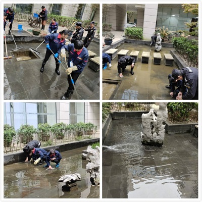 濃濃的春意,就連葉子也感知到了,新老更替,一片片葉子伴隨著陣陣春風(fēng),飄入景觀(guān)池水中,池底也覆著一層薄薄泥灰,物業(yè)主管組織員工一起清理景觀(guān)池。