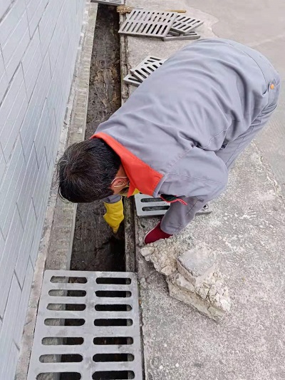 淌水溝的上面都是由鐵質的漏空蓋板排鋪,蓋板需要一塊一塊的搬起,保潔員在排水溝內進行清掃枯葉、清除雜草。因排水溝內還有管路,保潔員需先將管子抬起,才能進行清掃,先將煙頭、樹葉等垃圾掃成一坨,再用鐵鏟將垃圾鏟出,給另一位保潔員倒入垃圾桶內。淌水溝的高度較高,在清掃及鏟垃圾的時候也多有不便,淌水溝的距離較長,鐵質的蓋板又重,但我們的保潔員依舊將這項工作完成,不辭辛苦,一點一點的將之清掃干凈。有的區域的淌水溝較淺,在等待考試的學員便會蹲在那里抽煙、嚼口香糖,將煙頭、口香糖扔在溝里,保潔員們便只能用夾子一點點的夾出煙頭,口香糖印用鏟子一點點的鏟掉,將淌水溝打掃干凈。