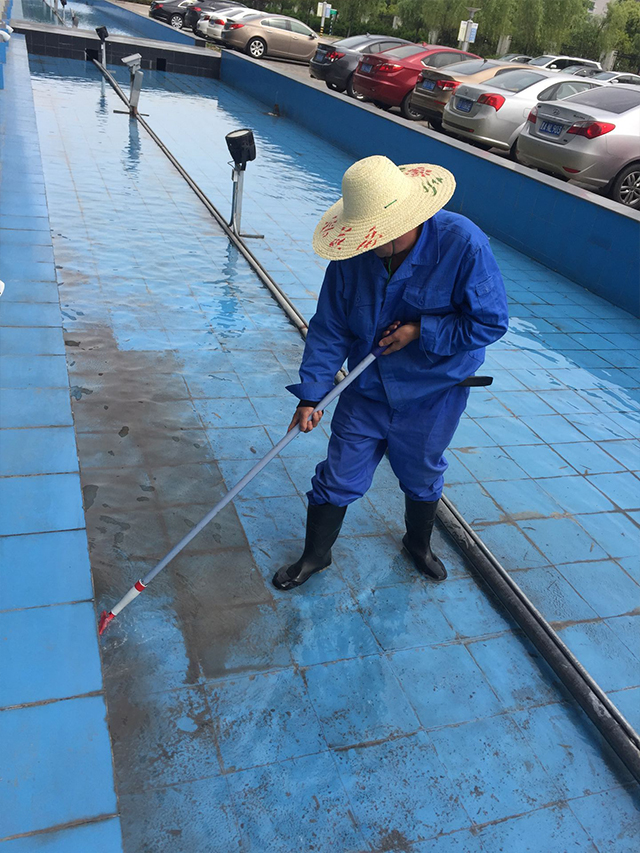 再難再臟的工作我們也要干漂亮!經過大家商量討論,排除用機器磨刷(雖然快但不干凈)的方法,還是采用多花功夫和精力人工鏟除污垢,這樣才能恢復水池的原樣。5月6日早上兩名專項人員腳穿雨鞋、頭戴草帽,下水池鏟除污垢。鏟刀要成45度角,水泥混雜了水垢后綁在瓷磚上面很結實,必須用力鏟下去,一寸一寸的啃。手上磨出了水泡、更換了3盒刀片,經過4天日曬,終于在5月10日把水池底部的污垢鏟除干凈;謴土怂乇趟{的本色,我們是水池的美容師!