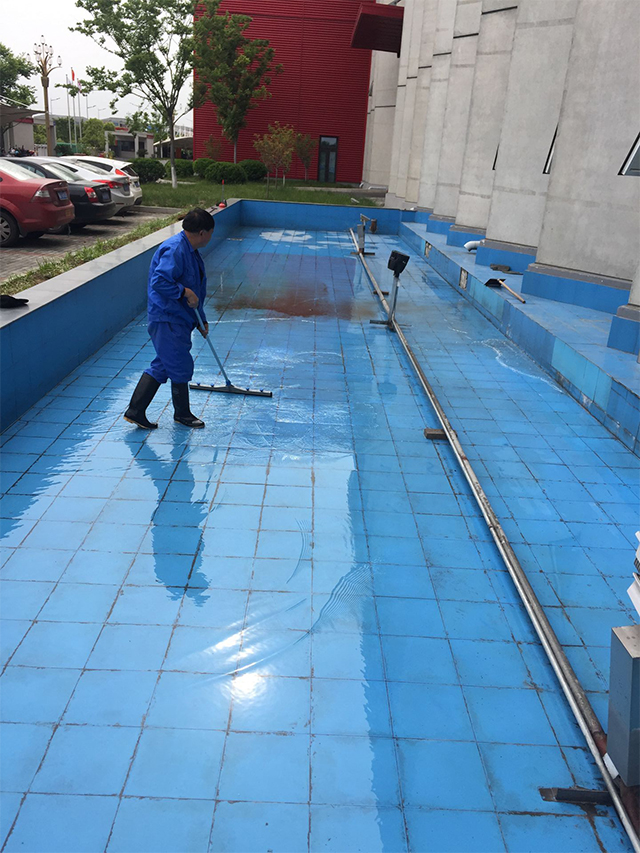 5月初同方威視1號成像車間南外圍水池邊上的竹林移栽別處,3個連環(huán)水池露了出來,甲方決定蓄水啟用水池。因水池長期不用,導致水池底部形成了大量水垢、水泥、污染物,并且屋頂的9個排污口的污水也直接排放該水池中。污染嚴重人員又少,清洗工作比較困難。