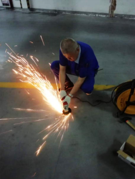 2019年6月5日這天最高氣溫35度,地表溫度達到了42度。本項目工程人員賀俊,在日常巡檢中,發現進入地下車庫的入口減速帶損壞,遺留下的釘子很鋒利,極有可能對進入車庫的車輛輪胎造成嚴重破壞,車輛輪胎一旦發生損壞后果不堪設想,賀俊第一時間攜帶工具,設立施工提示牌,展開了有效的切除。