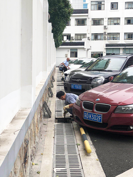第一:院內排水溝的雜物清理。外圍保潔與維修人員配合清理,確保強降雨時無雜物堵塞防護網,而造成排水不及時現象。