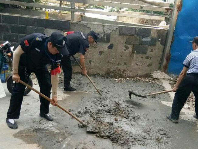 下午兩點,物業管理人員帶領保安、保潔開始整改。首先,由保潔把地面打掃干凈,然后保安鏟掉多余的泥土,有的保安用鐵鍬,有的保安用尖鎬,相互配合,很快一小片地面就鏟好了。其余的員工一起把黃沙、水泥倒在地面上加入水攪拌一下。拌好水泥再用鐵鍬放入挖好的地面上。最后用木板一點一點的把水泥攤平,整個整改工作持續了一個多小時。為了安全,我們對硬化好的地面周圍一圈用水泥袋還有路障圍了起來。