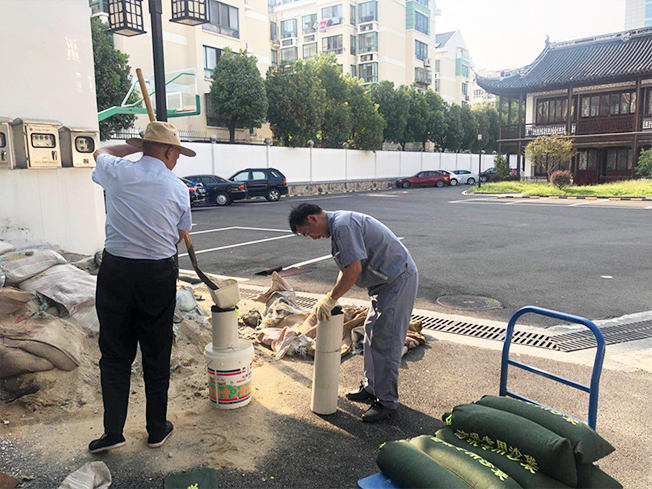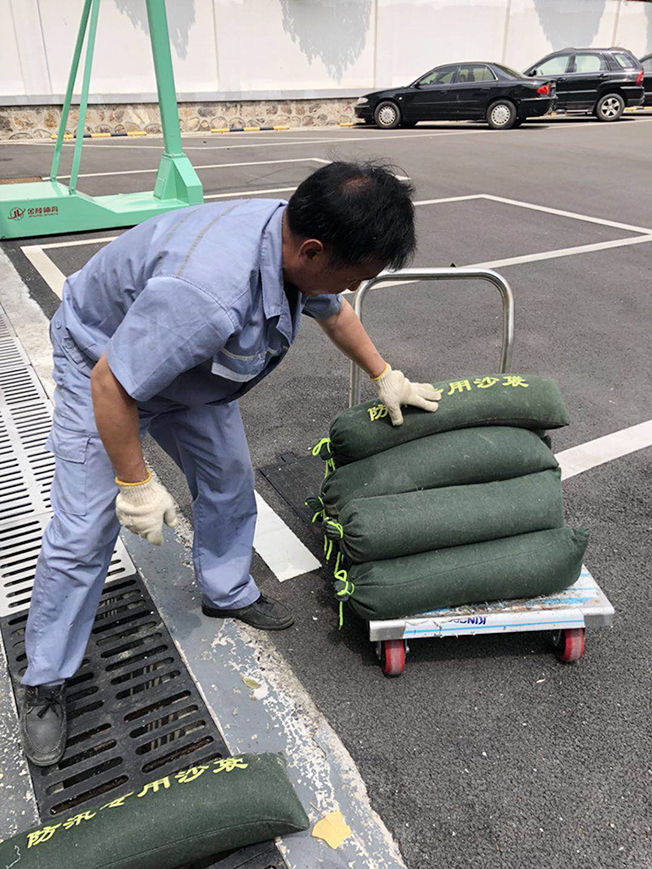 為預防可能出現的排澇問題,一袋袋的沙包被保安們整齊的堆放在各個防汛重點位置,用最短時間完成臨時防水工事,以防大雨過量,雨水回灌。防洪沙包輕巧,搬運簡單,收藏方便。去年經驗不足采購的是蛇皮袋灌裝沙包,經過幾個月的日曬,袋子都有開裂現象。今年特申請采購麻袋收口式:便于灌裝、便于搬運。且使用過后,晾曬干還能重復使用個3、5年,既環保又節約成本。