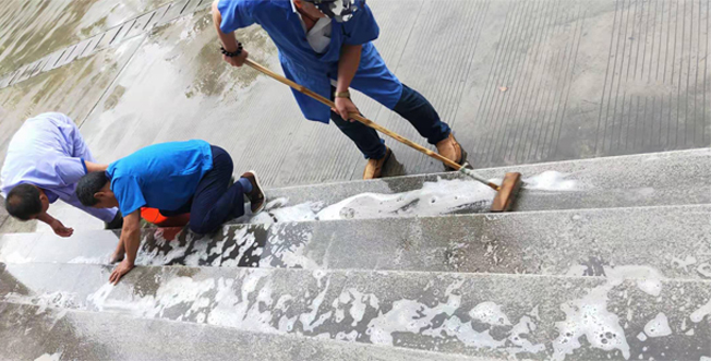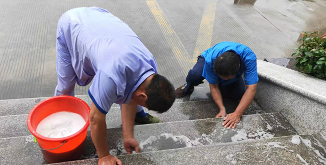 “好醫管”醫療事業部啟東市人民醫院項目部,2019年7月13日,外面雨淅淅瀝瀝的下著,看著西門口那黑不溜秋的臺階,不清洗又不行,怎么辦?一個工友說"干",說干就干,于是大廳的阿姨拿來了"正在工作"的禁示牌,放在平臺上,王師傅拿來了地刮刀、長刷子等清潔工具,同時還提了兩大桶開水,開始工作了。他們先在水里倒點洗衣粉,攪勻,然后把水倒點臺階上,三個人一個用清潔球刷,一個用長刷子刷,還有一個用地刮刀刮臟水,分工倒很協調。大廳的阿姨則負責讓過往的行人從側面行走。再看他們,刷了一梯又一梯,終于把那么大的一個臺階給刷完了。接著張師傅拿著桶去提干凈的水,他要把刷好的臺階上的臟水給沖掉,提了一桶又一桶,沖了一次又一次,同時沈師傅把剛才沒刷到的又清理了一下,王師傅把沖下來的臟水用地刮刀全部趕到下水道里。一切配合的那么默契。外面的雨還在淅淅瀝瀝地下著,而我們的三個師傅不怕辛苦,冒雨把臟兮兮的臺階刷得那么的干凈,真的要給他們點一百個贊!