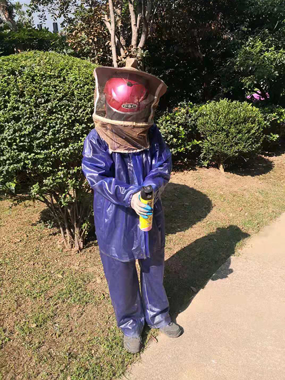 考慮到小區(qū)業(yè)主的安全出行,經(jīng)理與綠化師傅擬定處理方案,買來滅害靈,讓綠化師傅穿好防護服,戴好防護裝備,來到現(xiàn)場對蜂窩進行噴射,經(jīng)過半個多小時的奮戰(zhàn),終于把蜂窩安全摘下,并放入袋中封存,隨后又再次對小區(qū)進行排查,杜絕漏網(wǎng)之魚。