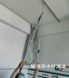 本周,項目經理安排保潔阿姨們對病區樓層上的輸液吊水桿進行清潔,每個樓層的保潔阿姨負責自己區域的吊水桿。他們首先用毛套沾上清潔水將桿子從上到下清潔,再用濕毛巾進行擦拭,最后再用干毛巾將桿子擦干,確保吊水桿上無污垢。