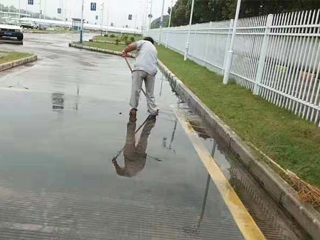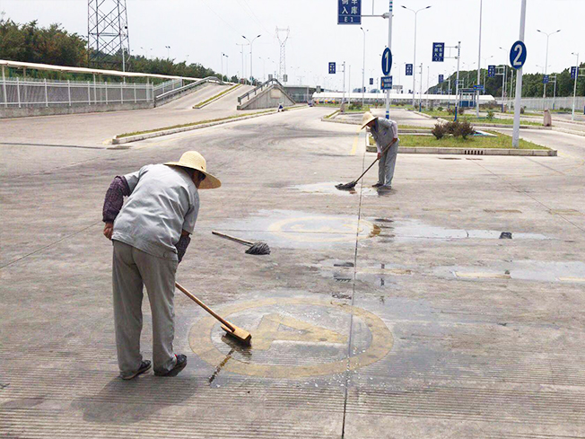 我們利用不考試不訓(xùn)練的時間空檔,對場地及地標(biāo)進行了一個清理工作。因工具有限,我們保潔人員只能一桶一桶的把水拎到所要清洗的地方,一個維保人員進行放水、裝水工作,這給我們的清洗工作延長了不少的時間,也降低了保潔人員清刷的速度。保潔員把水拎到所要清洗的地標(biāo)線,先用少量的水將臟地浸泡,再用硬毛地刷進行初步的清刷工作,再利用拖把進行一個拖擦,最后再用清水進行一個沖洗的收尾工作。為確保地標(biāo)線的干凈整潔度,及學(xué)員考試的順利進行,我們對E區(qū)所有嚴重黑漬的地標(biāo)線進行了清理工作。然因為下雨使E區(qū)場地比較低洼,積水嚴重的地方沉淀了一層厚厚的黑漬,我們又對E區(qū)場地進行了二次清理,利用雨水、積水對場地進行清刷,然后用大竹掃帚將污水掃進下水溝里,使E區(qū)變得干凈整潔。