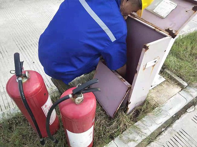 全場地的滅火器將近有百來個,所以清理起來工程量也是非常巨大,我們先從科二五個區內的滅火器、滅火箱擦拭,因有些滅火箱的使用時間過長,導致滅火箱上油漆都脫落,擦拭的時候只能輕輕的,防止其他處的油漆也脫落;有些滅火箱是放在泥土里,箱子的底部的泥土擦拭不掉,只能用鏟子輕輕給它鏟干凈,滅火箱內的臟東西也要用鏟子一點點的鏟出來。滅火器擦拭時也要非常的小心,擦的時候不能將滅火器的插銷給弄掉。維保人員在擦拭前都會對滅火器進行檢查,滅火器壓力表是否有損壞、變形等缺陷;壓力值是否正常(綠色值為工作壓力值);壓把、閥門等金屬件是否有銹蝕;噴管是否有老化、堵塞;如有問題,應及時上報更換。