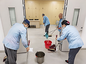 臨近下班之時,醫院突發緊急狀況。院區主管道污水井滿溢,再加上施工排管的影響,污水從尚未封閉的管道口洶涌倒灌進地下室培訓室。由于地下室缺乏排水溝和下水道,污水無處可排,致使室內滿地都是污水,臭氣彌漫整個地下室。 面對如此糟糕的情況,我們緊急安排保潔人員進行打掃清理。保潔師傅們只能用掃把和畚箕掃水,再將水一桶一桶地往外拎。污水流入口在柜頂,這使得柜子也被殃及,抽屜和柜體里滿是污水,保潔阿姨耐心地逐個抽屜進行擦拭。洗地車也投入使用吸水。值得注意的是,地面還有插座,增加了清理的難度和危險系數,但保潔們仍然穿著雨靴進入清理污水,她們的敬業精神令人欽佩。