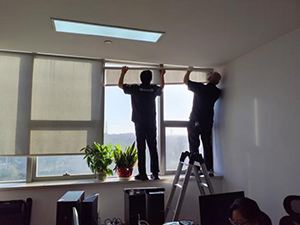 此時正值正午,室外陽光強烈,410 辦公室因沒有窗簾遮擋,辦公區域被曬得發燙。賀師傅深知大家的需求,更換好拉繩后沒有片刻耽擱,立刻聯系保安馮師傅幫忙。兩人抬著維修好的窗簾趕回 410 辦公室,一人扶著窗簾,一人固定軌道,配合默契,以最快速度完成了窗簾的重新安裝。