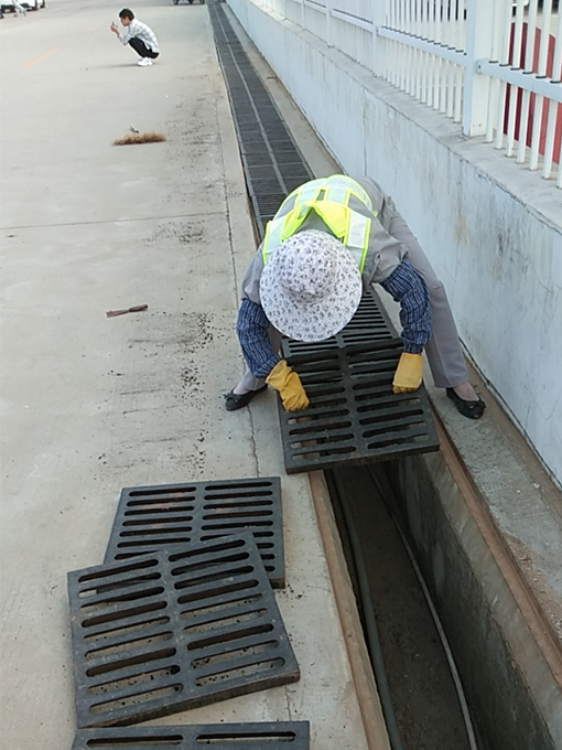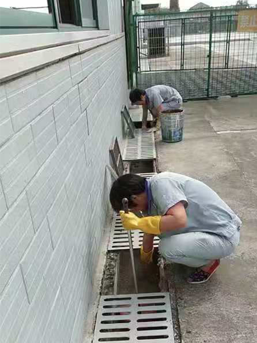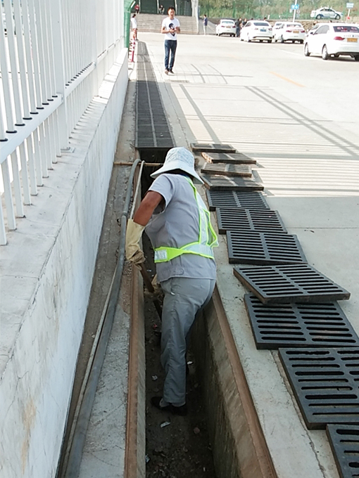 淌水溝的上面都是由鐵質的漏空蓋板排鋪,蓋板需要一塊一塊的搬起,安排一個保潔員在排水溝內進行清掃,因排水溝內還有管路,保潔員需先將管子抬起,才能進行清掃,先將煙頭、樹葉等垃圾掃成一坨,再用鐵鏟將垃圾鏟出,由另一位保潔員倒入垃圾桶內,淌水溝的高度較高,在清掃及鏟垃圾的時候也多有不便,淌水溝的距離較長,鐵質的蓋板又重,但我們的保潔員依舊將這項工作完成,不辭辛苦,埋頭苦干,一點一點的將之清掃干凈。有的區域的淌水溝較淺,在等待考試的學員便會蹲在那里抽煙,嚼口香糖,將煙頭,口香糖扔在溝里,保潔員們便只能用夾子一點點的夾出煙頭,口香糖印用鏟子一點點的鏟掉,用手捻出,將淌水溝打掃干凈。