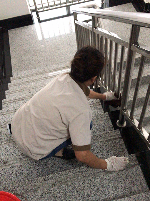 常州特檢院大樓投入使用已有十幾年,大樓樓梯間墻面受潮破損嚴重,影響美觀。特檢院項目部與甲方領導協商決定利用國慶假期人員放假的情況下對樓梯間墻面進行全面修復。假期第二天,施工人員進院操作,物業安排人員協助其工作,先對墻面破損地方鏟除并用膩子修補,再用乳膠漆對墻面進行全面噴漆,在大家辛苦的努力下,終于完成了墻面修補。前期工作的完工,預示著物業后期打掃也要進入一個新的征程。一到七樓,整個地面鏟下來的墻皮和灰塵以及墻面脫落的油漆,讓人無從下腳。但是我們的保潔人員不怕臟不怕累,分工明確,有條不紊加班加點的在甲方上班前完成了整個大樓的清理以及細節衛生打掃。雖然大家都汗流浹背,灰頭土臉,但是看著嶄新的墻面地面,項目部所有的員工都露出了欣慰的笑容。