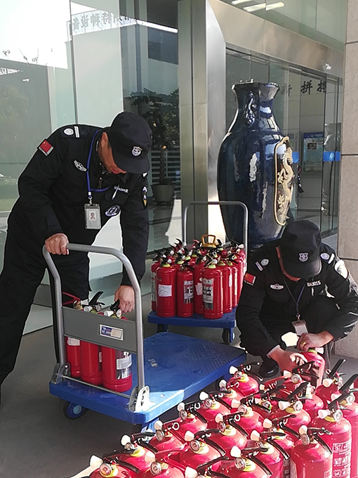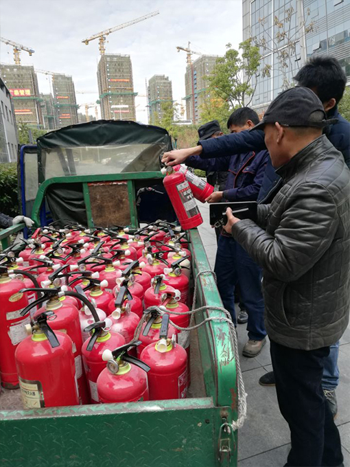 2019年12月,根據登記,特檢院滅火器到期需要更換充裝。物業主管提前報備甲方負責人,并聯系專業充裝人員來園區對滅火器檢查。由于院區滅火器購買時間已久,部分可能需要報廢。物業主管先請專業人士對滅火器進行試壓檢查,對需要報廢的滅火器報備甲方報廢,需要充裝的進行充裝。物業協助各樓層滅火器分批收集更換充裝,并對報廢的滅火器進行統一處理。