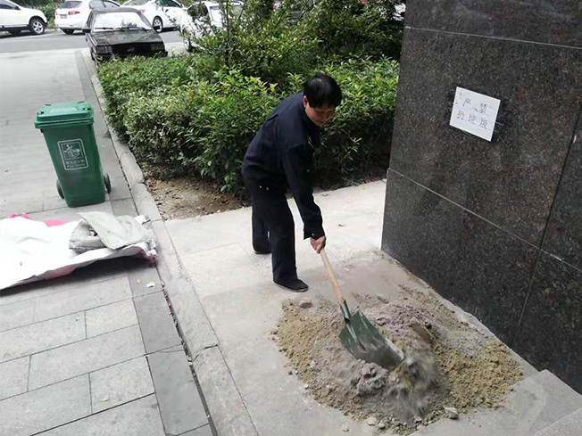 經(jīng)與樂聚物業(yè)負(fù)責(zé)人協(xié)商,對方允許敷設(shè)水泥,澆灌路面,但施工須由我方自行解決。在獲得業(yè)主移動方領(lǐng)導(dǎo)同意后,移動高正物業(yè)項(xiàng)目部立即響應(yīng),組織保安、保潔人員想辦法弄來石子、水泥、黃沙等基礎(chǔ)材料及施工工具,齊力施工。
