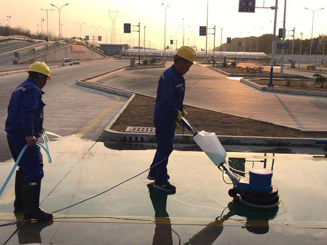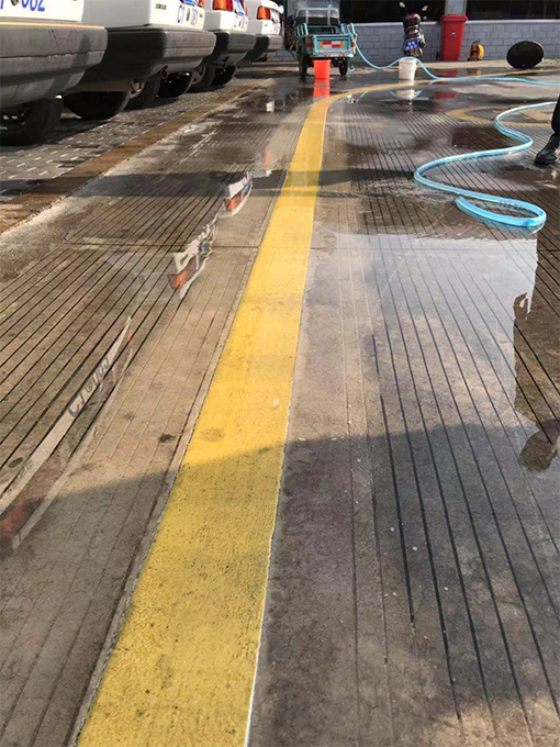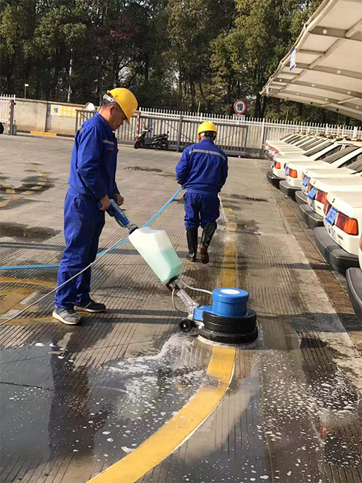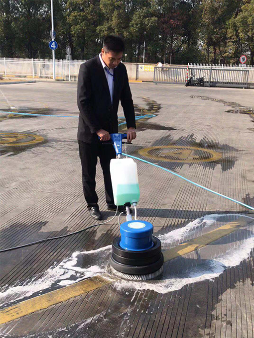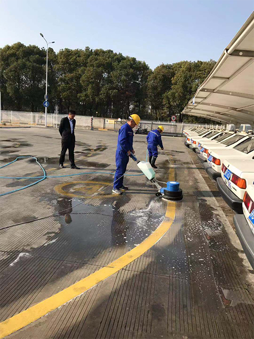 以前,清洗場地地標線都是人工進行清洗,不僅需要預備十幾個保潔員,且因保潔員在用地刷刷的時候用力有限的,清刷出來的地標線仍有灰蒙蒙的。為此,我們物業在星期五下午不考訓時,將新配備的洗地機進行了初步試用。因保潔員都未曾使用過此機器,項目經理便親自進行教授此機器用法及使用時需注意事項,考慮到需要掌控機器的力較大,保潔員都是女士,無法將其掌控,便安排了一個維保員來進行學習及后期的清洗工作。在學習會機器的使用方法后,便先對一段黃線地標線進行清洗,與未清洗的地標線進行對比,確實干凈很多,也亮了很多。看到效果后,我們便對E區整場地的地標線進行清洗。雖說使用機器洗方便,不過,因場地設計特殊性,還是安排了3-4名保潔員在機器清洗后,一個用水管清水進行沖洗,其他保潔員用大竹掃帚進行清掃,防止積水。最終,經過一天的努力,終將E區場地黃色地標線全部清洗干凈。