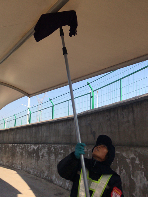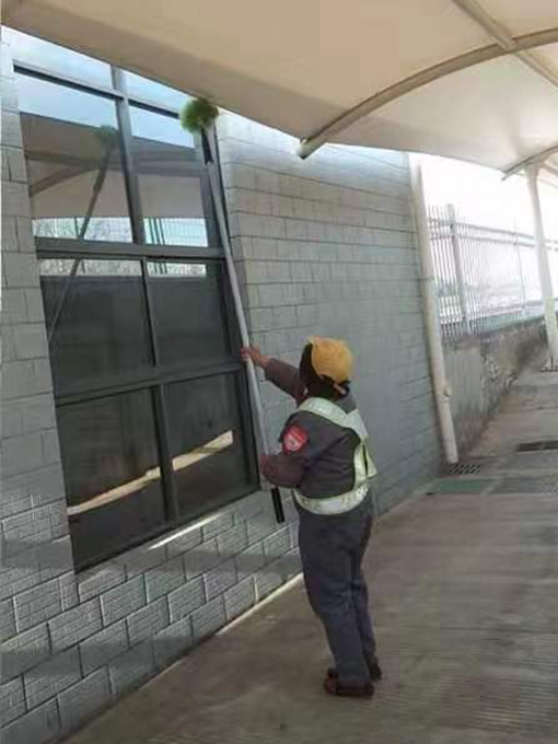 雨棚全長靠八百米左右,且因風吹雨打日曬的,看起來比較臟,起初在撣掃的時候,是想用長柄的玻璃刷進行擦拭,可以將上面的灰塵擦拭掉,可是在實踐中卻發現并不可行,收縮的伸縮桿較重,較粗的毛頭擦不到夾縫里,沾濕的毛巾擦在雨棚上,越擦越臟。因此,我們只能另改工具,用撣掃蜘蛛網的圓形撣子進行撣掃。果然,效果較好。撣子上的不銹鋼管事空心的也比較輕,撣球在撣掃時夾縫里都能撣掃掉,雖然不能雨棚上的污漬撣干凈,但能把上面得的一層灰都能給撣掉。在撣掃過程中,會有人來人往的訓練學員,我們會提醒他們,注意頭頂落灰,注意撣掃的桿子。以防桿子打到腳,導致摔倒。雨棚雖長,但我們一絲不茍的將之撣掃干凈,讓學員有更好的考訓環境,讓駕校更加干凈美麗。