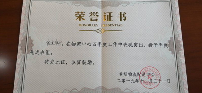 隨著2019年尾聲,迎來2020年的鐘聲,總結2019年的工作,高正集團煙草項目部各部門員工都得到了甲方領導的認可,最值得慶賀的是煙草物流食堂班組,因在物流中心四季度工作中表現突出,授予甲方領導頒發的季度先進班組榮譽證書稱號。