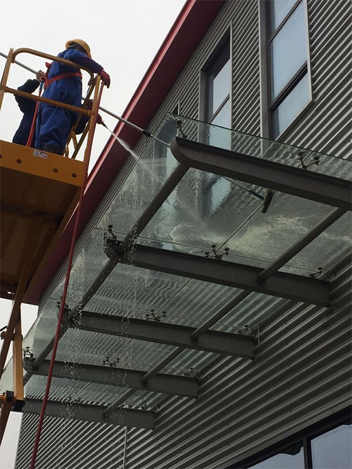 經過各部門領導簽字同意,項目組調整人員上班時間,明確分工:電工負責開登高車、一人上頂部沖洗、一人刮洗屋檐下方玻璃門、一人收放消火栓水管并處理地面積水、經理在下方進行登高車監護。20日一早,專項人員穿戴好安全防護繩、安全帽,帶上勞動工具。由電工駕駛登高車輛,進行清理沖洗工作。由于還要沖洗屋檐后面的墻面,加上屋檐玻璃積灰多,高層作業沒有足夠大的空間,專項人員一邊沖洗,一邊用毛套加伸縮桿進行推洗,推完后再次沖洗,最后刮去屋檐上方積水。稍不留意毛套、刮刀就會掉下來。高層清洗工作比較耗費體力,一個屋檐清洗下來,專項人員手臂也酸了。稍作休息又繼續下一個屋檐的清洗。下午項目組又安排人員繼續清洗全廠其他15個小的屋檐。