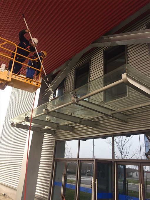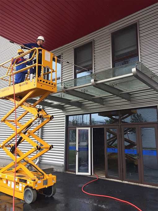 同方威視項目職能辦公區、5號車間前臺、6號車間前臺外面都有鋼結構屋檐。因屋檐淋不到雨,所以特別容易積灰塵。由于屋檐比較高,用梯子登高清洗,存在安全隱患。項目經理和甲方商量借用2號組合車間的升降式登高車,利用工人休息時間,進行高層作業--沖洗屋檐。
