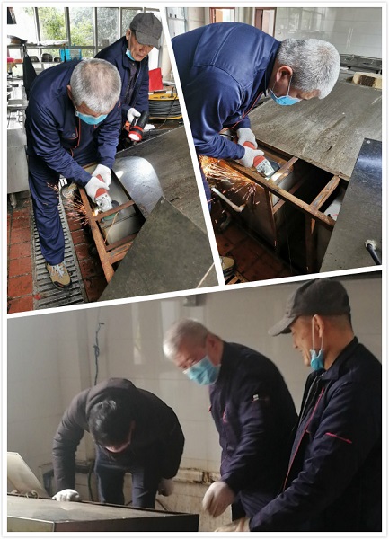 這周一開始食堂要為員工們正常供應飯菜了,食堂的員工把所有需要用的炊具、鍋碗瓢盆都檢查清洗了一遍,結果檢查到蒸飯箱加溫異常。隨后食堂負責人就找到了我們物業的丁主任,反應了這一情況。丁主任喊來我們的“萬能”修理工賀俊師傅,賀師傅隨后就拿起他的工具包,和主任直接就去了食堂,看了看情況以后,有點棘手,又打電話叫了個幫忙的下手,3個人幫忙把蒸飯箱傾斜過來,開始用切割機把加熱管切下來,看似簡單的活,他們幾個人費了好大勁才把幾根加熱管都給弄下來,然后還得把新的導熱管一個一個安裝好。安裝好之后還得把所有的水管,電線都接好,外行人覺得麻煩的事情,到他們專業人士的手里就感覺好輕松,不過,雖然就是簡單的換加熱管,他們幾個人也弄了差不多兩個多小時呢。