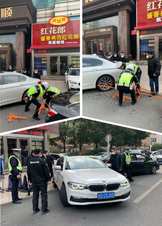 3月16日早高峰時(shí)段,一輛白色寶馬車(chē)因?yàn)楣收峡ㄔ诹藝鷻谏希略诹穗x投資廣場(chǎng)停車(chē)場(chǎng)入口不遠(yuǎn)處的路中間,導(dǎo)致業(yè)主的車(chē)輛無(wú)法正常進(jìn)入停車(chē)場(chǎng)。項(xiàng)目部陶經(jīng)理在發(fā)現(xiàn)此情況后,盡管馬路不在物業(yè)管理范圍,為了業(yè)主能準(zhǔn)時(shí)上崗,她積極組織輪崗的保安以及工程部師傅們,協(xié)助趕來(lái)的交警一起挪車(chē)。經(jīng)過(guò)大家共同的努力下,用時(shí)30分鐘,終于將車(chē)子成功挪出。