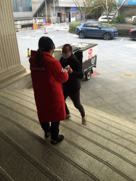 在大樓的證券公司業主向投資廣場項目部發來了緊急求援,他們的消毒水用的不夠了,這樣會大大降低每天防疫消殺作業效果。投資廣場項目部葉佳在自身防疫消毒水不足的情況下,主動提出可以帶一瓶消毒水給18樓業主。在全員帶口罩的情況下,要尋找辨認一個人還是比較困難的。只見葉佳每天早早就來到大樓的測溫點認真的給每一位進入大樓的工作人員測溫,一邊尋找業主。突然就見葉佳拿出一瓶消毒水跑下臺階給一個人,邊給邊說:“您好,您要的消毒水”,業主連連道謝。
