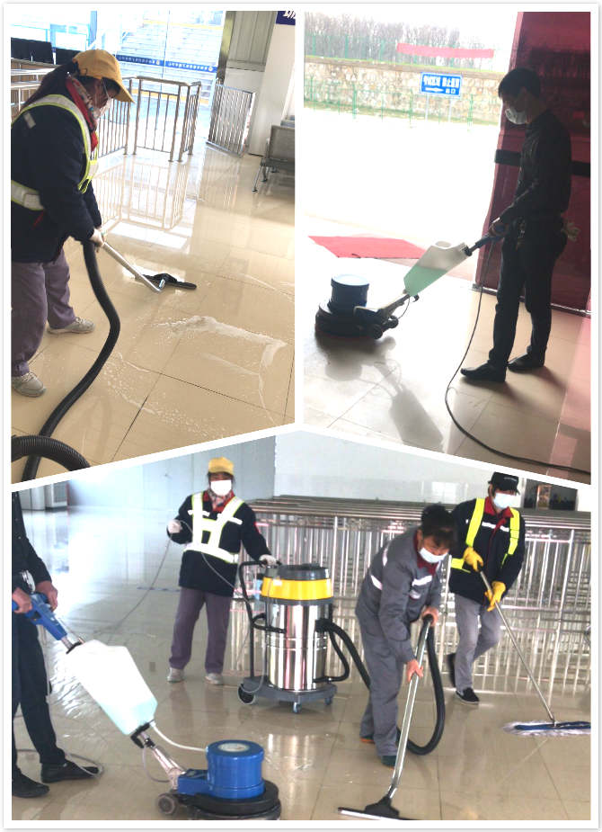 在清洗前,物業(yè)人員先將室內的休息椅等物體搬離,并安排水電工做好電源及洗地機、吸塵器各部件的檢查工作,同時將全能清潔劑倒入桶中加水攪勻稀釋備用。然后將洗地機推至清洗點位置,裝入稀釋好的清潔劑,開機操作,噴出清潔液,刷盤擦洗,并沿直線行走。對于較厚和較難清理的污垢,用加大濃度的清潔液稍稍浸透再進行來回擦洗,同時打開吸塵機開關,邊進行擦洗邊吸走污水,最后用干凈的干塵推布做最后的收干工作。在下班前,將洗地機、擦拭干凈,吸塵器內污水倒掉,里面泥垢清理后用清水沖洗干凈。
