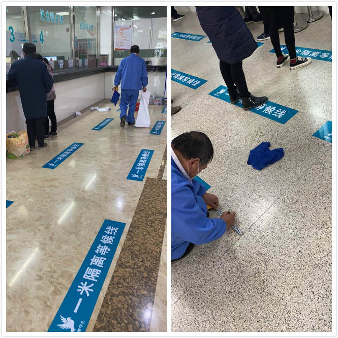 為了做好疫情防控工作,“好醫管”醫療事業部--啟東人民醫院項目部物業門診主管接到醫院宣傳科電話,要求我們在盡可能快的時間內,在各個掛號收費、取藥、檢查等窗口地面上張貼一米距離間隔地標。