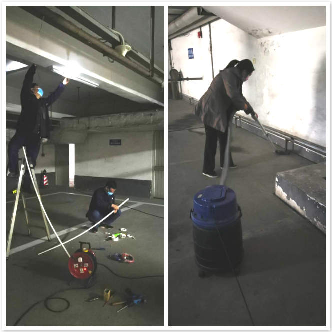 在關閉車庫的同時,項目部組織工程部和保潔對大樓的地下停車庫燈光進行更換維修,對地面進行吸塵清掃。一大早工程部的師傅們就拿上檢修工具早早的來到地下車庫,逐一對車庫里的照明燈進行排查。在排查的過程中發現有一盞照明燈壞了,為了方便業主停車也為了停車的安全,師傅們拿出維修工具和新的燈管對線路進行重新排布。在師傅們對車庫線路的改造的同時,投資廣場保潔部的工作人員也利用這次機會對車庫也來個大清潔。為了不揚起大的灰塵,只見何秋萍拿著大功率的吸塵器對地面進行吸塵。不一會兒,師傅們也弄好了,何秋萍渾身上下弄了一身灰,但是看著地下車庫里一片明亮和整潔,他們都會心的笑了。