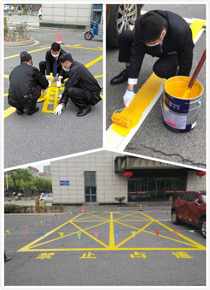 對于在地面畫線這個事,我們也是第一次操作,大家群策群力,互相配合。別看我們的保安都是男的,干起活來可真是細致,一絲不茍,先在地上把標線貼好,然后再畫,油漆不能沾太多也不能太少,剛開始不熟練,畫的比較慢,后來漸漸找到了竅門,就越畫越快、越畫越好了。畫完又再檢查修補了一遍,讓整體看上去顏色均勻一致。最后又把場地清理干凈,四周圍起來,防止有人或車誤入踩踏,等地面干后就可以投入使用了。甲方對這次工作十分滿意,稱贊我們保安能干。