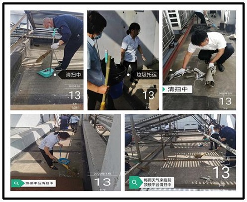 5月13日,公路事業發展中心項的丁主任發了一條信息在我們的工作群里,需要我們在班上的物業人員下午3點30分一起去12樓頂清掃下水口垃圾。我們項目部的物業團隊所有人員都很積極的,3點15分就都到了樓頂開始他們的清掃工作了。為了營造優美的辦公環境,丁主任帶領我們清理下水口的垃圾,他自己也是不怕臟不怕累,一起動手清理。