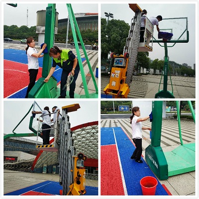近期3V3籃球賽即將在奧體會展中心前面的廣場上舉行,甲方安排師傅們把籃球框安裝好后發(fā)現(xiàn)籃板上比較臟,需要清理干凈,就打電話給奧體中心項目部,溝通希望保潔去清理下。