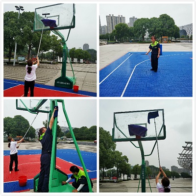 經(jīng)過半小時,大家把籃板弄得干干凈凈,最后地面上還噴灑了消毒劑。甲方領(lǐng)導來看后非常滿意,稱贊我們做事細心、靈活。
