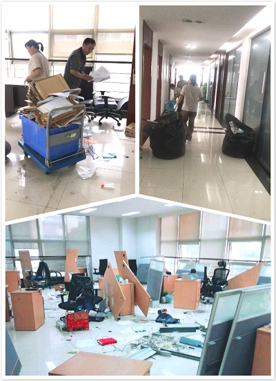 第二天保安隊長帶領常日班保安師傅,保潔班長帶領全體保潔冒雨前來單位,把樓層搬遷后的垃圾清運,并把樓層衛生打掃完畢,方便施工人員進場對樓層進行裝修。