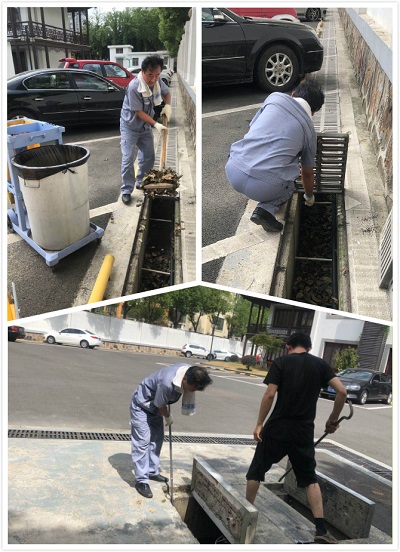 工程部對排水溝各個網口檢查,給各網口加一道防護網,確保不會有雜物進入排水泵,影響水泵工作。再打開各雨水井,用自制工具,清理雨水井的樹葉等雜物。打開抽水泵保護蓋板,觀察抽水泵的工作狀態;確保抽水泵是可以處于自動啟動、停止的模式,保證抽水泵不會因為干抽而燒壞。