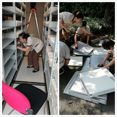 8月7日依舊高溫天氣,在戶外清掃保潔,光是站著不動都會出一身汗,就在這時我們接到甲方通知要幫他們把檔案室清理出來。檔案室里密密麻麻的堆滿了資料,網格化的柜子給清理帶來了麻煩,爬上爬下也不方便,于是我們就把所有鐵皮柜子拆下來用拖車拖到洗車的地方沖洗。保潔員們頂著大太陽一塊一塊的清洗,長年累月的積灰要用清潔劑才能去除,工作量比較大。