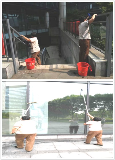 8月10日下午,烈日炎炎,她們來到了大廳進行外場玻璃清潔工作,F場保潔員們動作熟練麻利,先用玻璃清洗劑噴灑,然后用毛巾擦拭,伸手夠不到的玻璃,便用伸縮玻璃刷擦拭,她們一遍遍重復著手里的動作,實在累了,就換個姿勢進行。連續2個多小時的清洗工作,汗水濕透了她們的衣裳。在所有保潔員的齊心合力下,大廳恢復了明亮干凈。