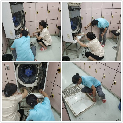 雖然空調是放在室內的,但里面的灰塵可一點都不少,在更衣室工作的保安也主動幫忙。她們先把擋風板輕輕拆下來,把濾網全部拿到水龍頭下面,一邊用刷子刷,一邊沖洗。雖然隔段時間就打開清理,但里面還是很多臟東西。她們找來細鉛絲、板刷、抹布等工具,慢慢伸進去,從里往外一點一點把垃圾清理出來。真是看不出來,里面居然這么臟,清出來的垃圾足足有一垃圾袋。清完再用刷子刷,抹布擦,兩人蹲在地上腿都麻了,雖然不是力氣活,但也熱得出了一身汗。最后再把濾網、擋風板全部裝上,重新啟動空調,吹著涼涼的風,頓時感覺空氣好像也清新了不少。