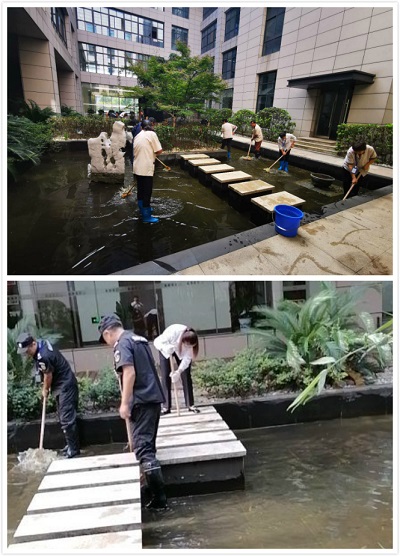 首先保安孫師傅把浮在水中的樹葉打撈干凈,把小金魚撈出來先放水桶中,然后把景觀池的水放干。同時(shí)其他保安師傅、保潔人員和會(huì)務(wù)也找來了清理工具,長(zhǎng)刷子、手套、雨靴水桶之類的。沒一會(huì)兒工夫,水已經(jīng)放干,大家紛紛入池把有泥污的地方一點(diǎn)點(diǎn)的刷干凈。其中邊角處最是難清理,但大家都干勁十足,很快景觀池就被清理干凈了,大家伙臉上都露出了欣慰的笑容。